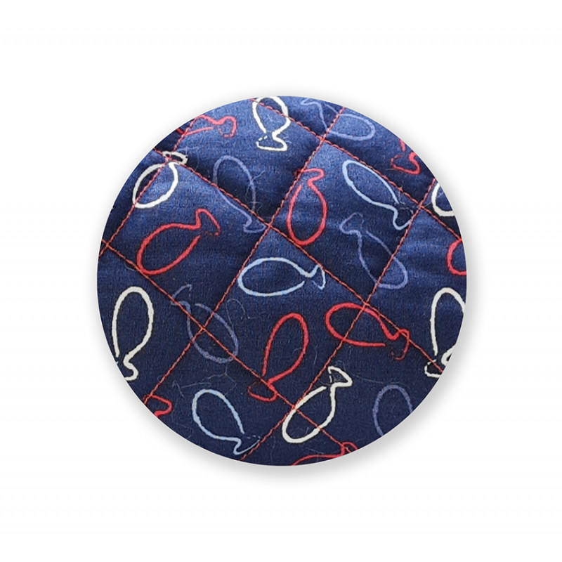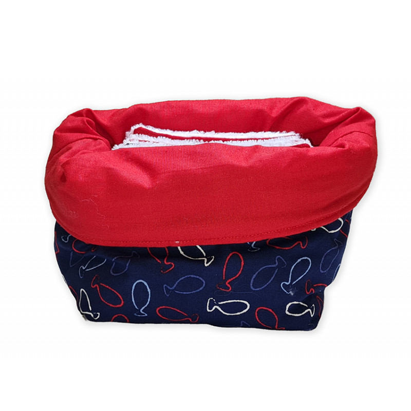Panier : intérieur rouge, extérieur bleu avec motif marin. Matelassage avec de la ouate hypo-allergénique pour plus de douceur